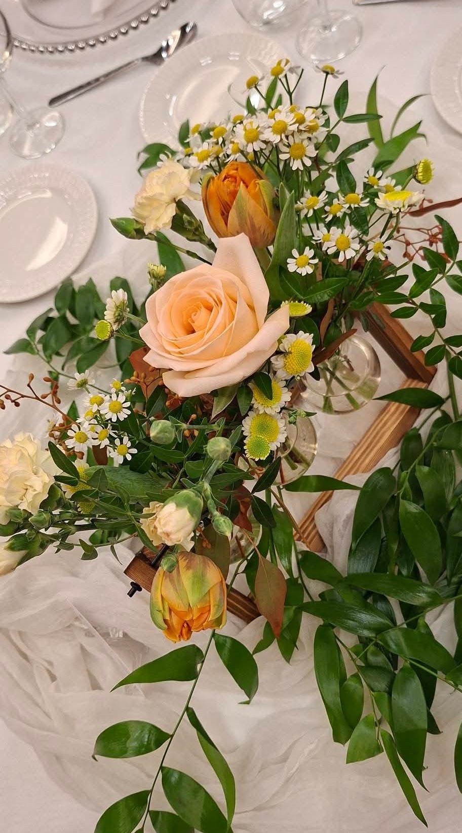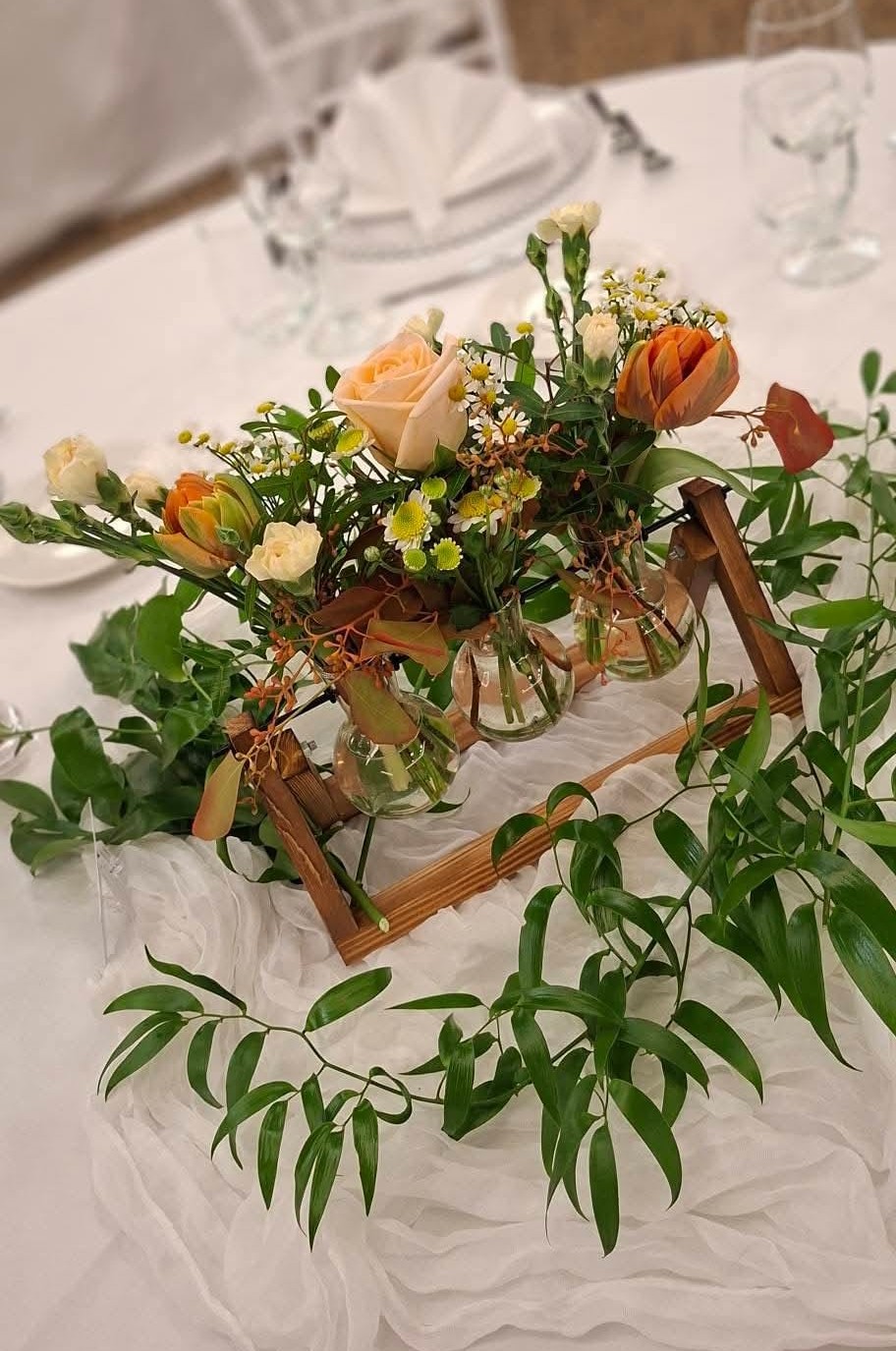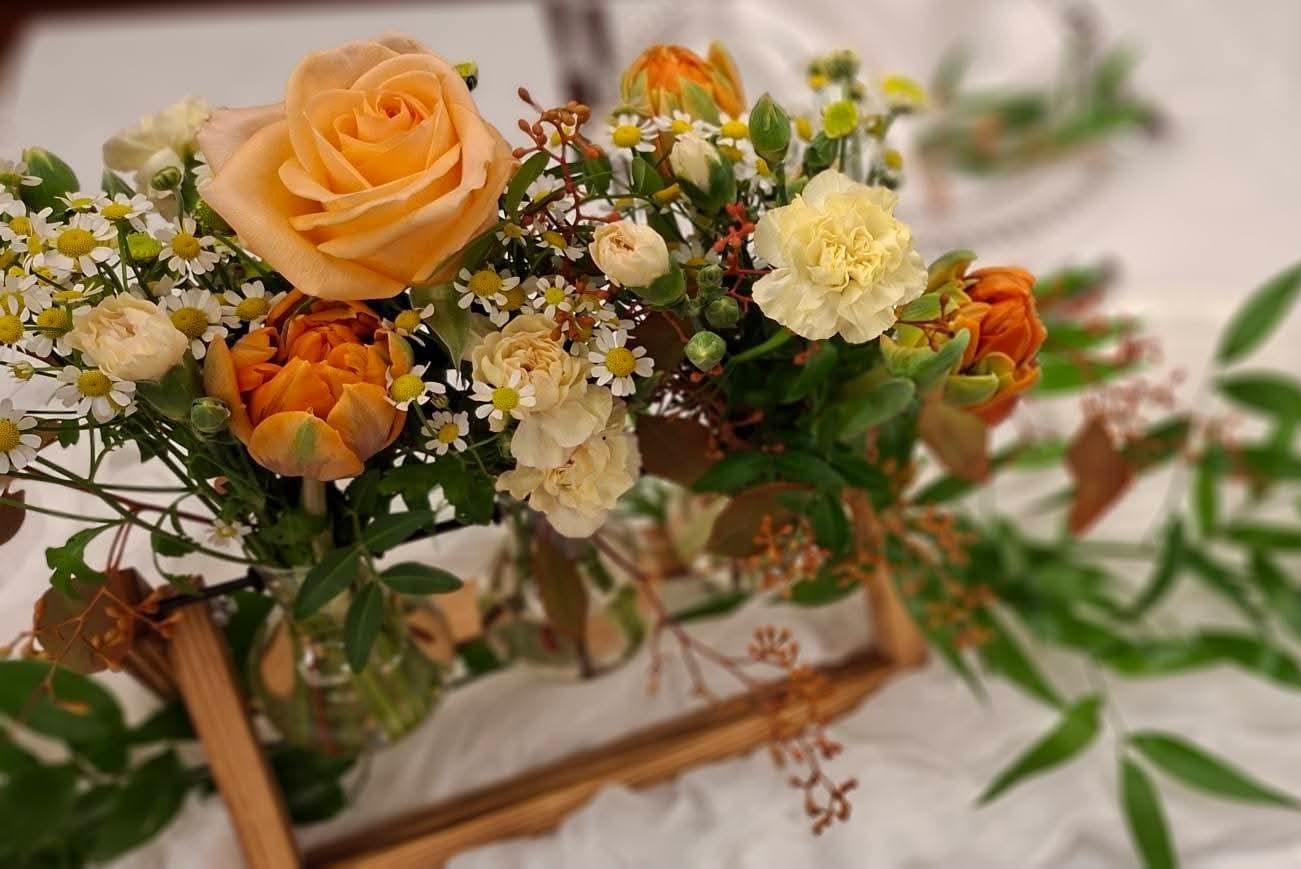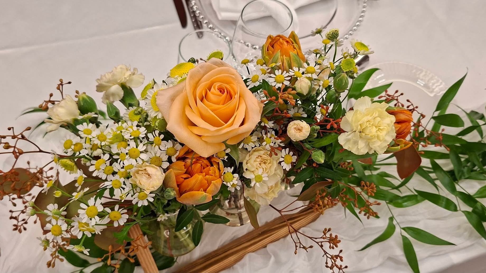 Acest aranjament floral, realizat pe suport tip eprubete, a fost creat pentru o cununie desfășurată toamna, având un aer cald, elegant și natural. Paleta cromatică specifică sezonului de toamnă cu nuanțe arămii, piersică, nude și îi aduce profunzime și rafinament decorului.