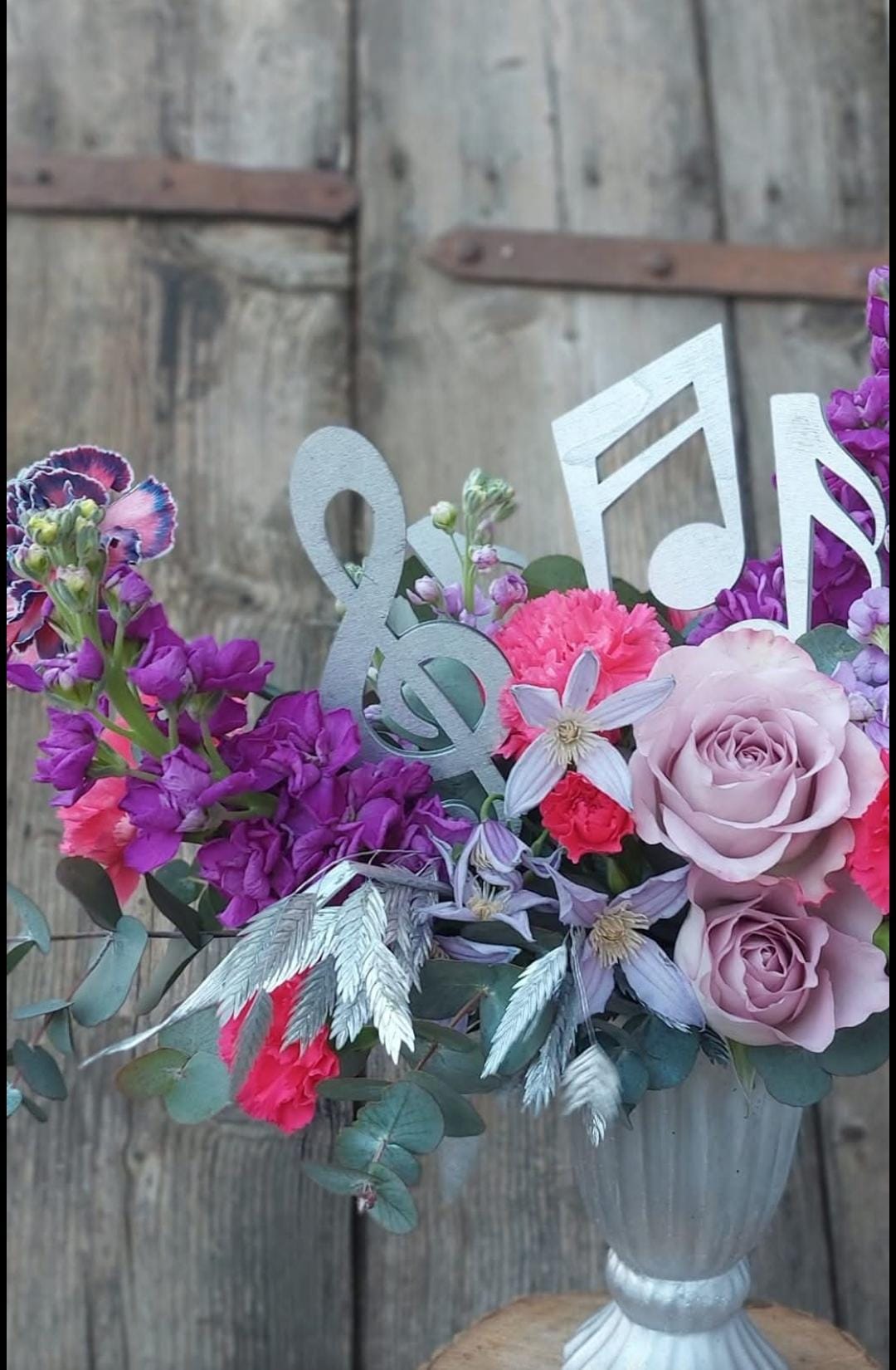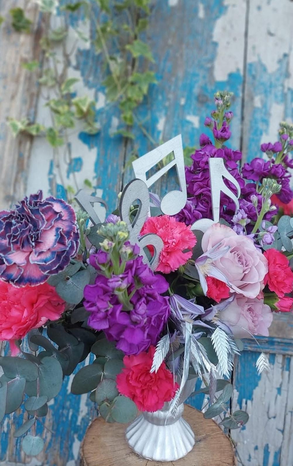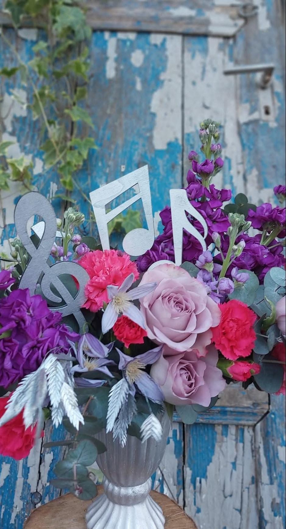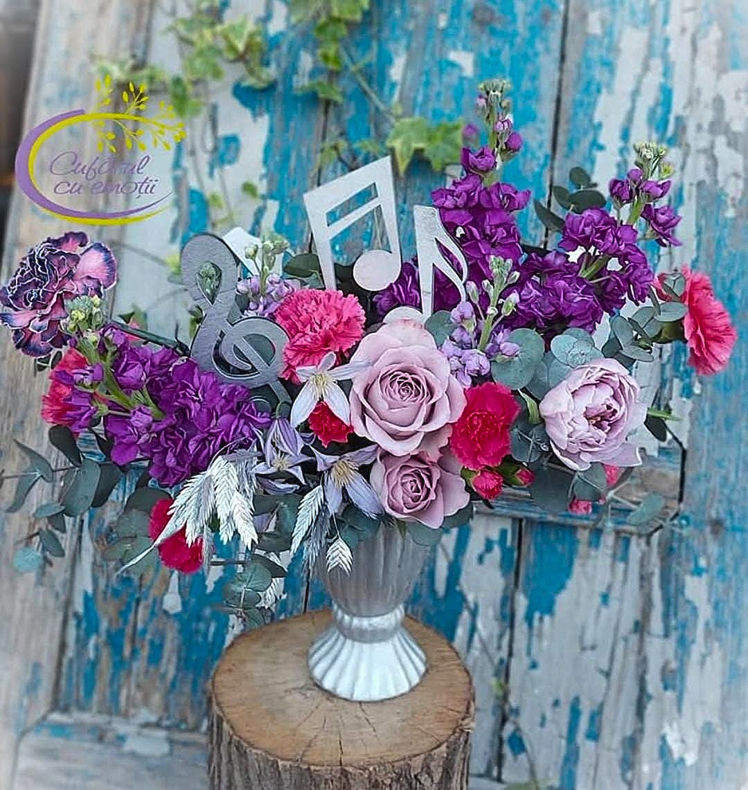 Un aranjament floral elegant, în nuanțe catifelate de violet, lila și roz pal, care îmbină rafinamentul trandafirilor memory lane, cu parfumul discret al mathiolei și delicatețea lalelelor. Notele muzicale din lemn transformă această compoziție într-o adevărată simfonie vizuală și emoțională.