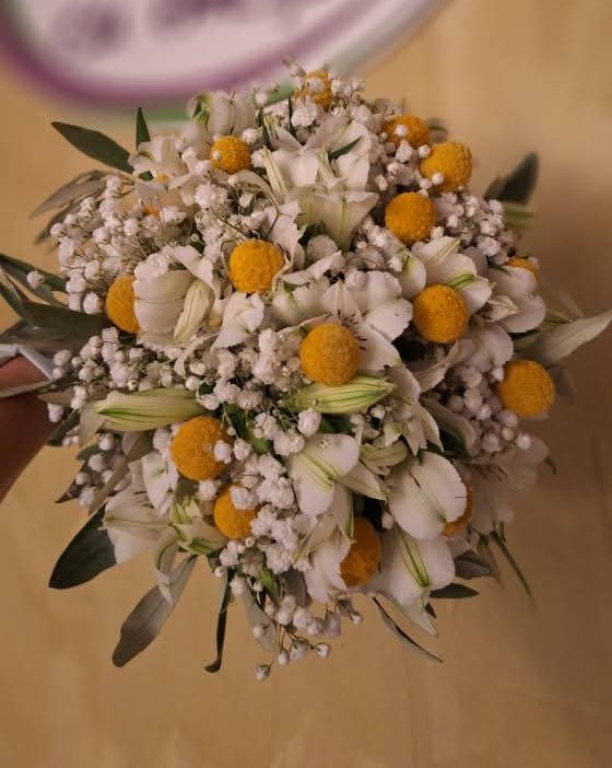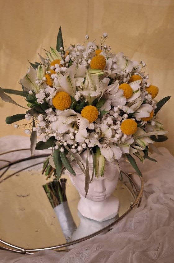 Compoziția îmbină alstroemeria delicată cu gypsophila aerată, care adaugă volum și lejeritate, craspedia – accentul jucăuș și modern al buchetului – și ramuri de măslin, simbol al păcii, longevității și armoniei. Împreună, aceste elemente creează un buchet care radiază naturalețe și optimism.