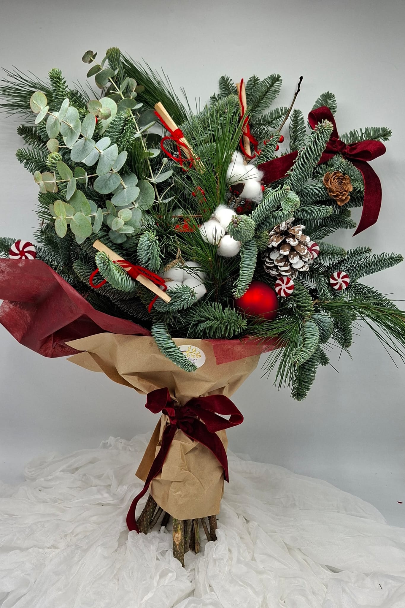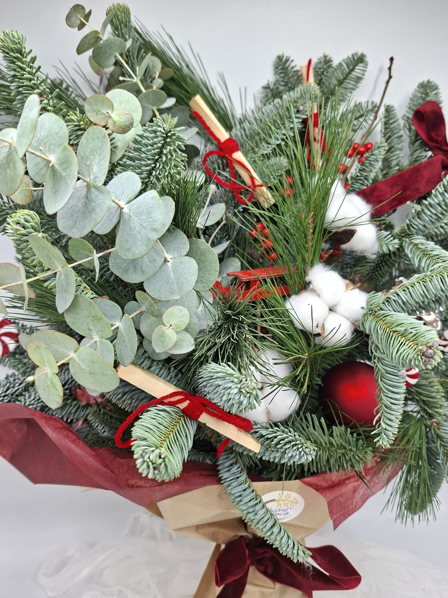 Acest buchet de sezon este realizat dintr-o combinație armonioasă de brad argintiu (Nobilis), pin și eucalipt, plante alese pentru rezistența lor și pentru parfumul discret, dar recognoscibil, specific Crăciunului.
