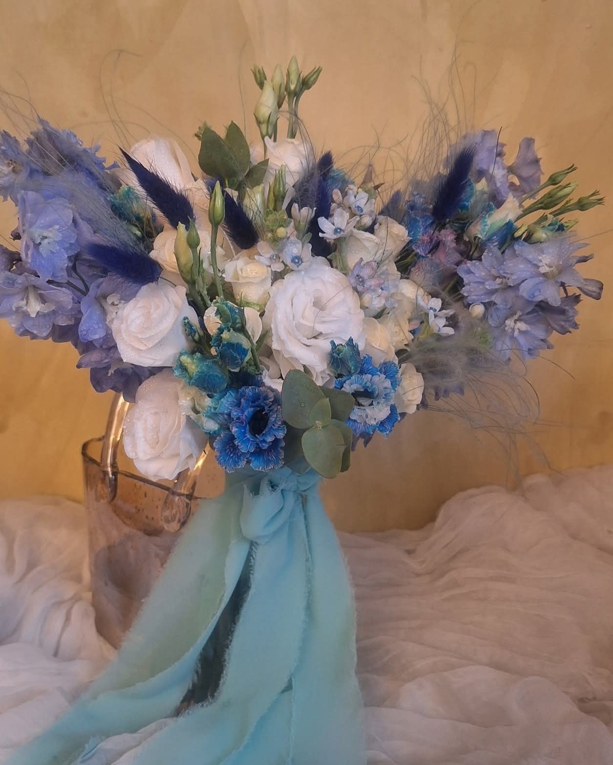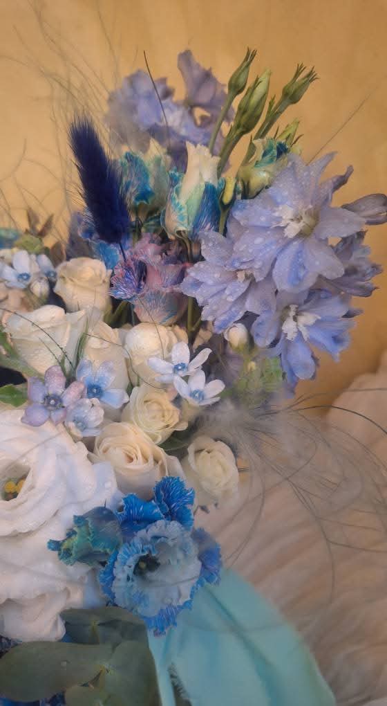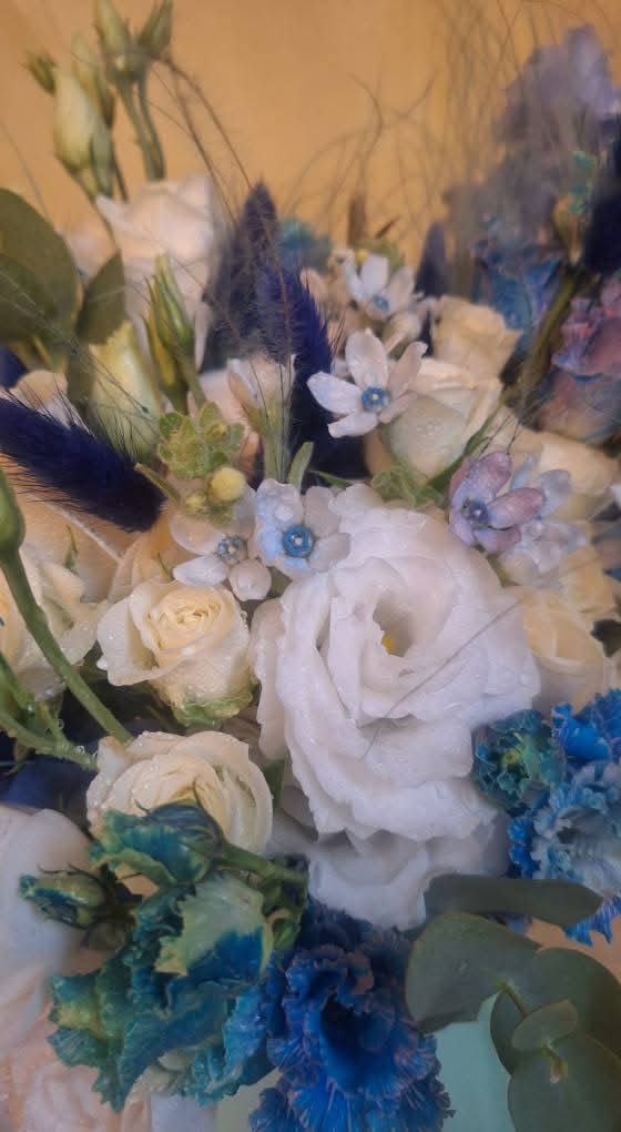 Compoziția îmbină texturi fine și flori aerate: stipa pennata bleu și lagurusul adaugă senzația de plutire și libertate, în timp ce delphiniumul și lisianthusul pigmentat albastru creează accente proaspete. Trandafirii albi, oxypetalumul și lisianthusul alb echilibrează cromatic buchetul, oferindu-i lumină și eleganță.